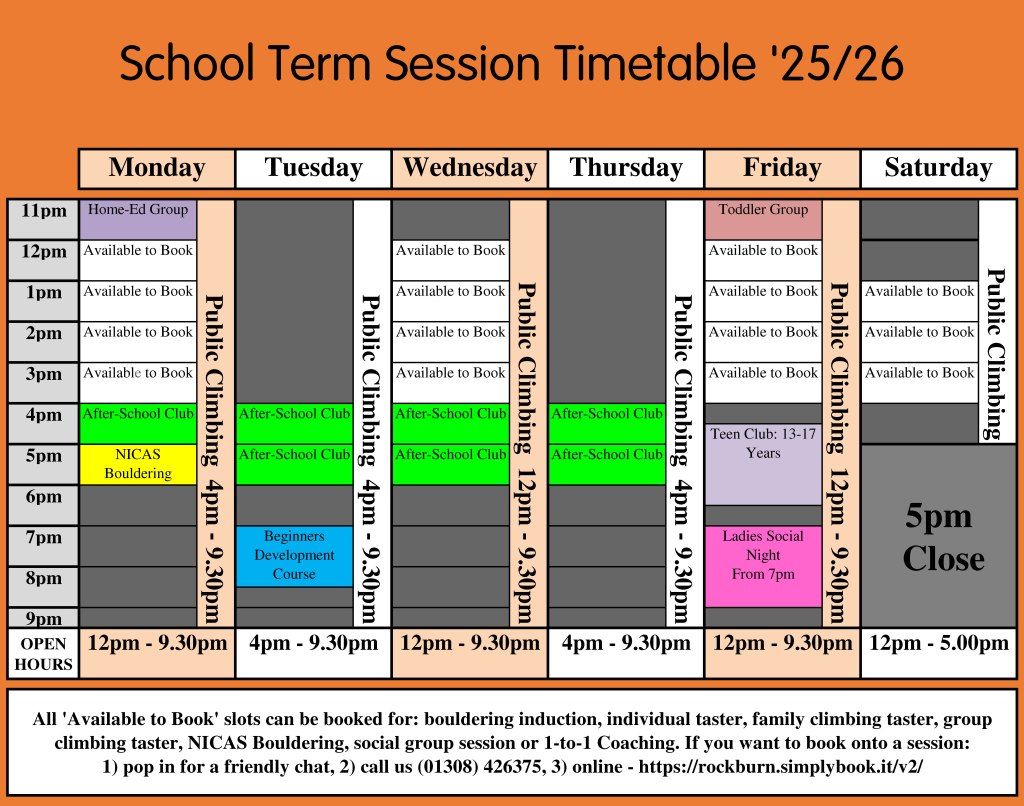 | Day | Climbing Centre & Games Cafe Hours | RockCafe Hours |