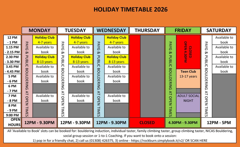 Teen Drop-in 13-17 Years (£12 per space – shoe hire included) – Fridays only: This session lasts for 2 hours. Parents do not need to stay onsite but must be present for the first 10 minutes of their child’s first visit and must contactable and able to attend the site within 5 minutes in case of emergency. An instructor will oversee the session and get the youths bouldering and completing climbing challenges and games. This session operates with a maximum of 12 children and is offered on a ‘1st Come, 1st Served’ basis. Shoe hire included in session price. On the initial visit, youths need to go through a mini-induction in order to come to T’n club: parents are required to be present for this and to read through all relevant documentation and sign along with their charge stating their intent to abide by the centre’s ‘Conditions of Use’ and ‘Rules of Rockburn’. This is compulsory on your first visit without exception.